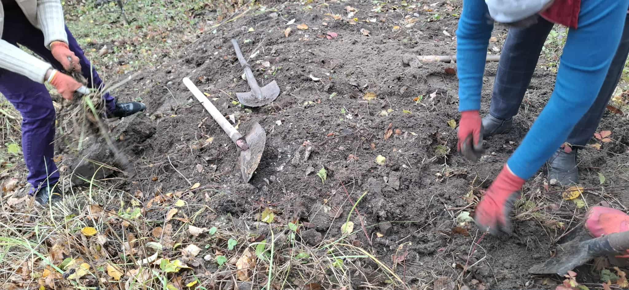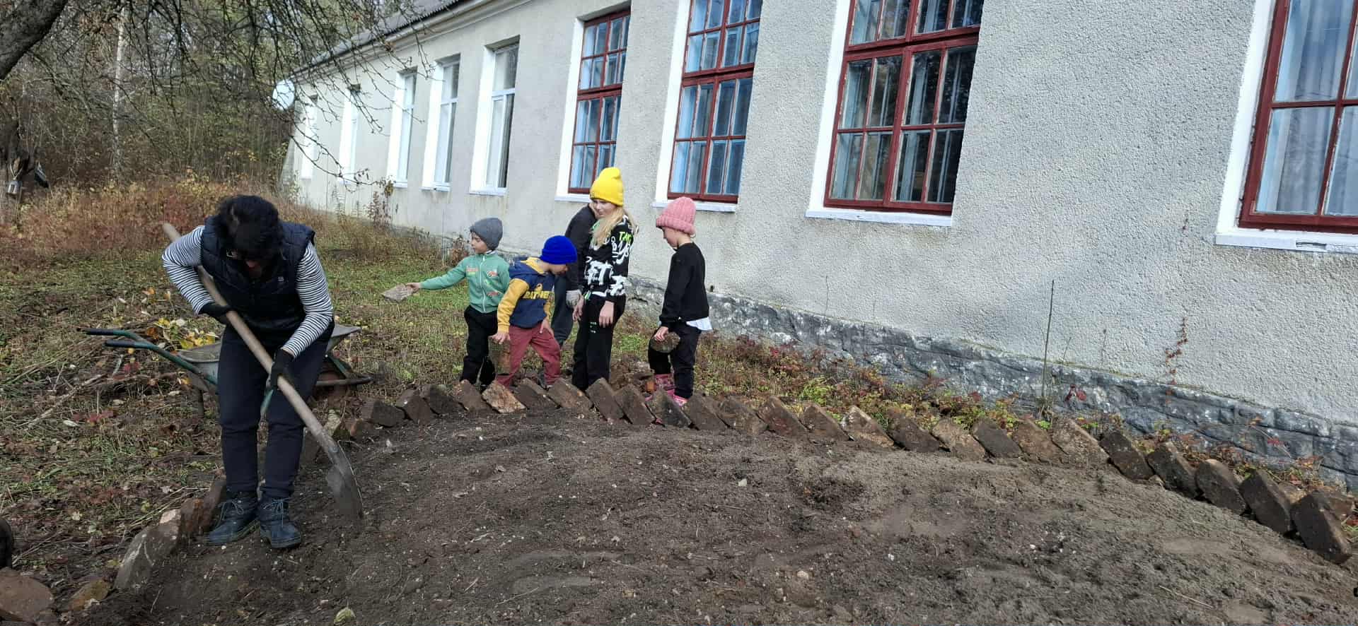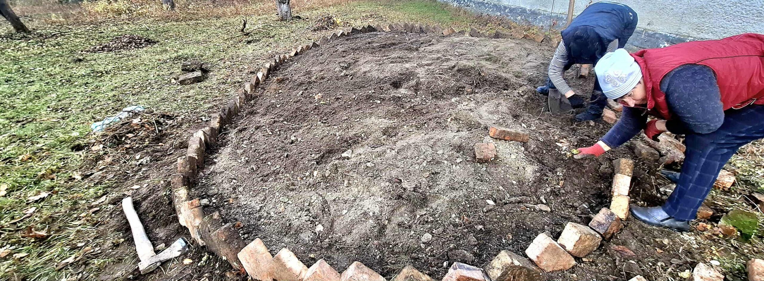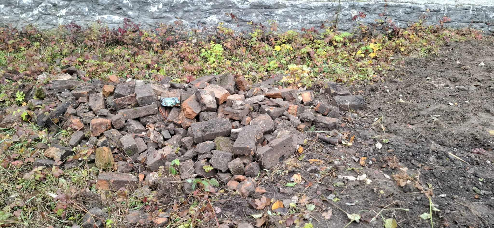 3/ Ми прибрали територію. Ми організували спільне прибирання: зібрали сміття, видалили дикорослі рослини та розчистили землю. Під час прибирання ми знайшли багато покинутих будівельних матеріалів: цегли та каміння. Ми використали цеглини, щоб створити бордюр навколо майбутньої клумби.